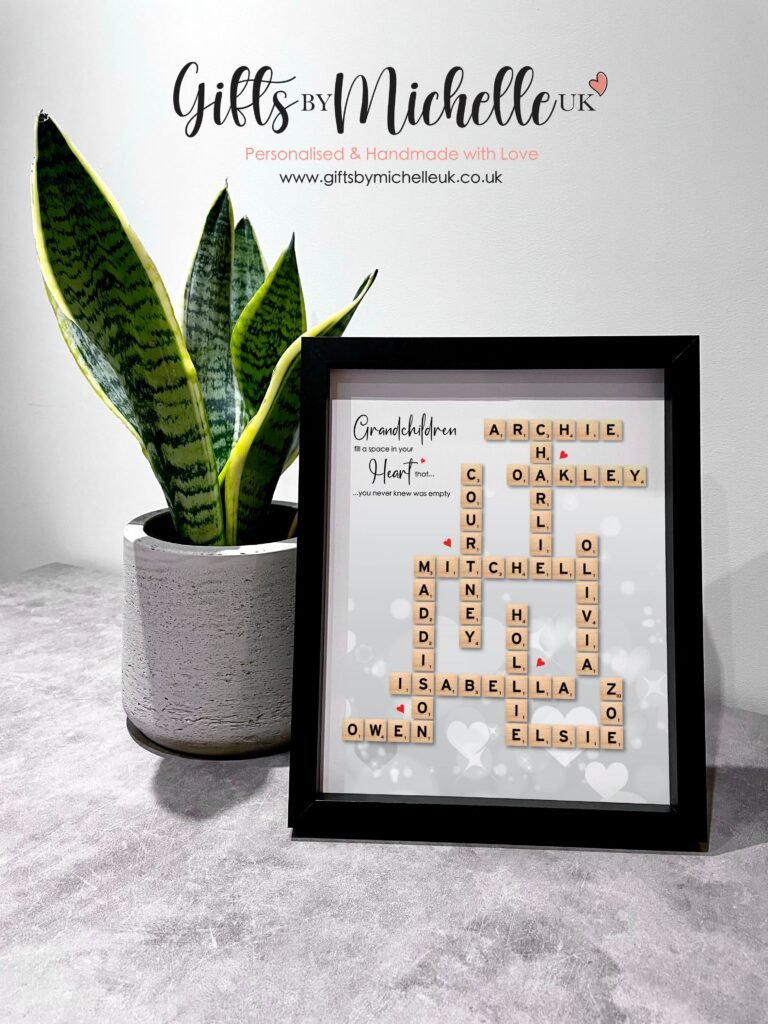 Friends and Families are all brought together to form these memorable scrabble frames. Decorated with wooden hearts and crystal scatters. Prints also available for frames with lots of names. Prices from £14 to £22.